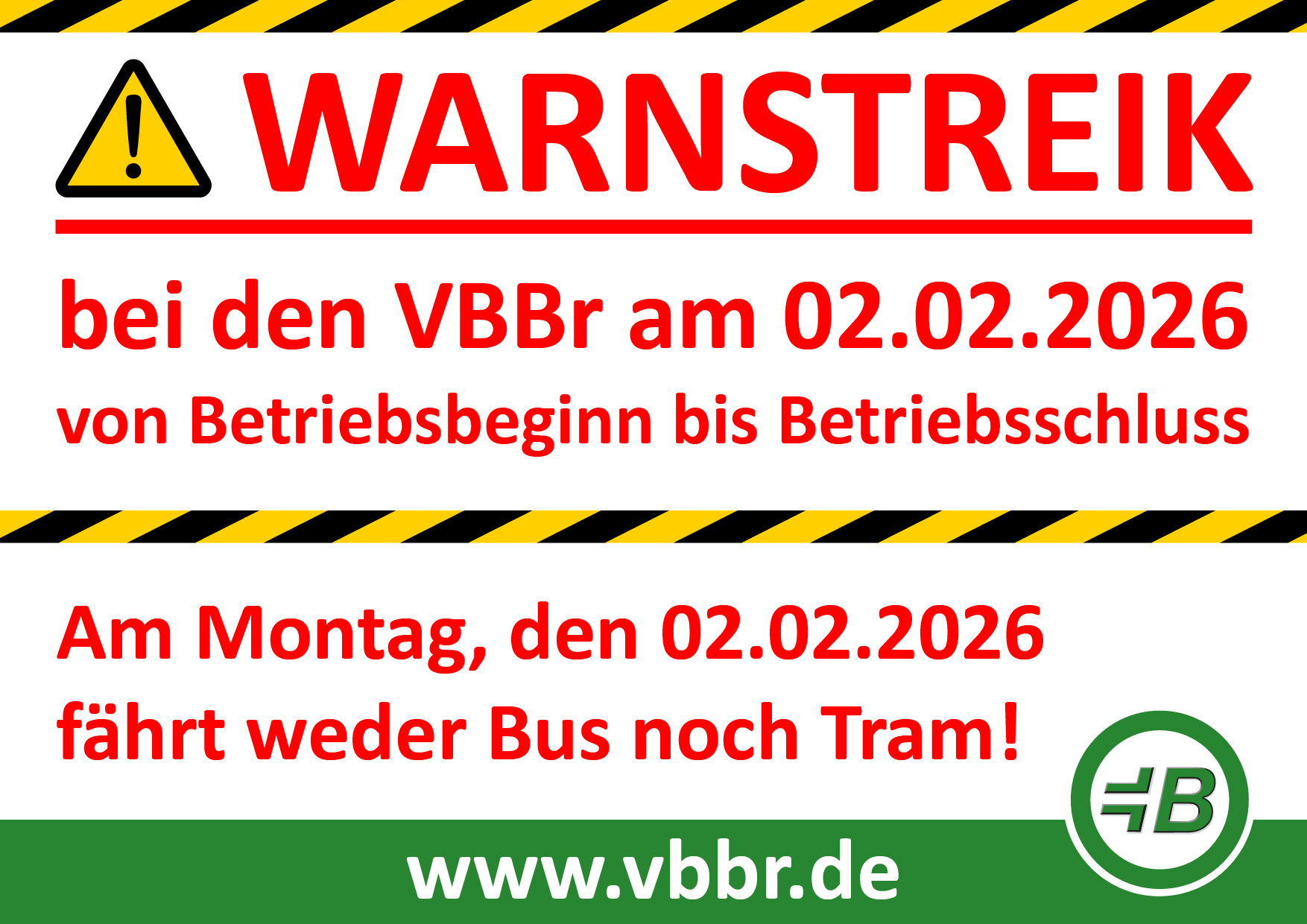 Die Gewerkschaft ver.di ruft zum Streik auf! Am Montag, den 02. Februar 2026 werden diverse Verkehrsunternehmen in Brandenburg bestreikt, darunter auch die VBBr.